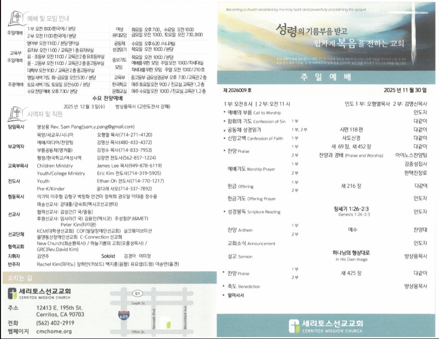 2025년 11월 30일 주일주보 페이지 정보 작성자 세리토스선교교회 날짜 2025-12-04 13:29 목록 본문 2025년 11월 30일 주일주보 다음글2025년 11월 23일(추수감사주일) 2부 주보 25.11.22 댓글 0 댓글목록 등록된 댓글이 없습니다. 목록