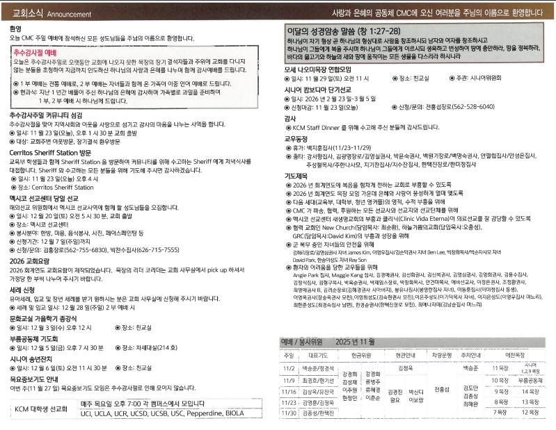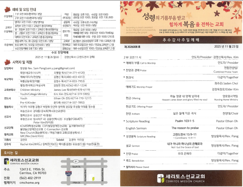 2025년 11월 23일(추수감사주일) 2부 주보 페이지 정보 작성자 세리토스선교교회 날짜 2025-11-22 15:20 목록 본문 2025년 11월 23일(추수감사주일) 2부 주보 다음글2025년 11월 23일(추수감사주일) 1부 주보 25.11.22 댓글 0 댓글목록 등록된 댓글이 없습니다. 목록