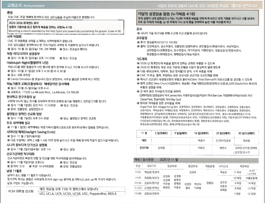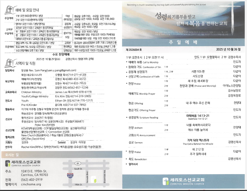 2025년 10월 26일 주일주보 페이지 정보 작성자 세리토스선교교회 날짜 2025-10-25 14:21 목록 본문 2025년 10월 26일 주일주보 이전글2025년 11월 2일 주일주보 25.11.01 다음글2025년 10월 19일 주일주보 25.10.18 댓글 0 댓글목록 등록된 댓글이 없습니다. 목록