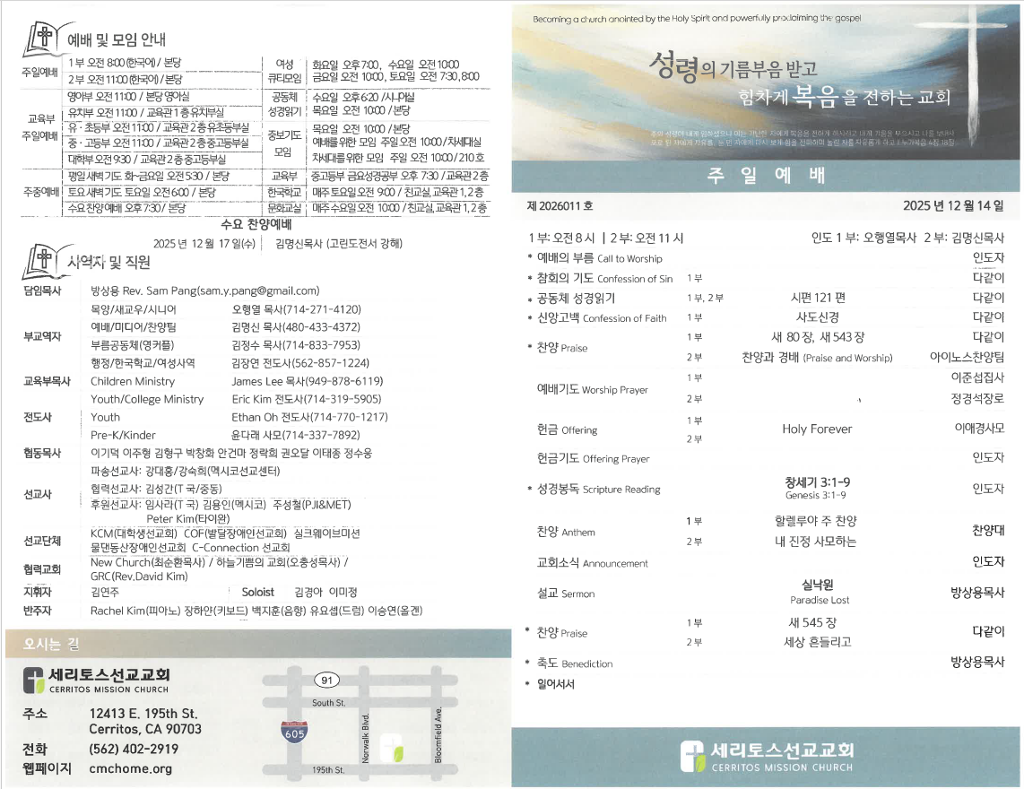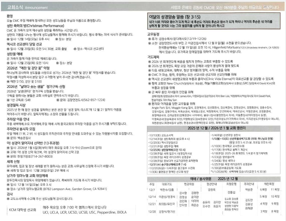 2025년 12월 14일 주일주보 페이지 정보 작성자 세리토스선교교회 날짜 2025-12-13 09:10 목록 본문 2025년 12월 14일 주일주보 다음글2025년 12월 7일 주일주보 25.12.06 댓글 0 댓글목록 등록된 댓글이 없습니다. 목록
